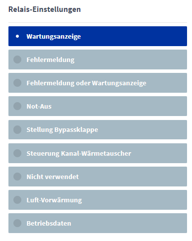 Dieser Abschnitt beschreibt die Einstellungen des 24-V-Relais des Lüftungsgeräts. Es kann jeweils nur ein Betriebsmodus gewählt werden.