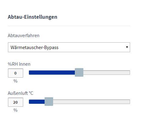 - Ventilator anhalten — Bei diesem Abtauverfahren wird der Zuluftventilator für die Dauer des Abtauvorgangs angehalten. Die Wohnung wird vorübergehend drucklos.