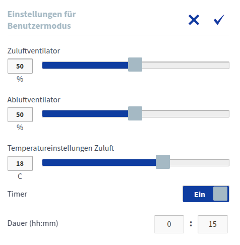 - Ventilatorleistung — Zeigt den Istwert der Zuluftventilatorleistung im Benutzermodus-Modus an.