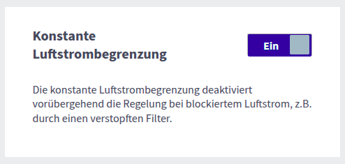 - Aktivieren oder deaktivieren Sie den Konstantluftstrombegrenzer mit der Ein/Aus-Taste auf der rechten Seite des Textes Konstantluftstromgrenze.