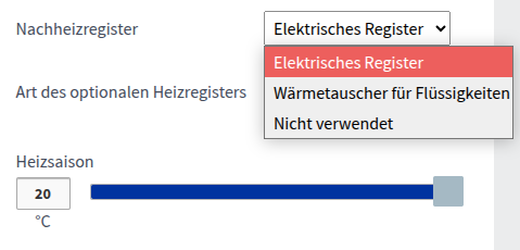 Die Außentemperatur löst den saisonalen Heizbetrieb aus. Ist die Außentemperatur niedriger als der Sollwert, wird bei Bedarf das Nachheizregister zur Erwärmung der Zuluft hinzugeschaltet. Der Bypass beträgt bei der WRG immer 100 %.