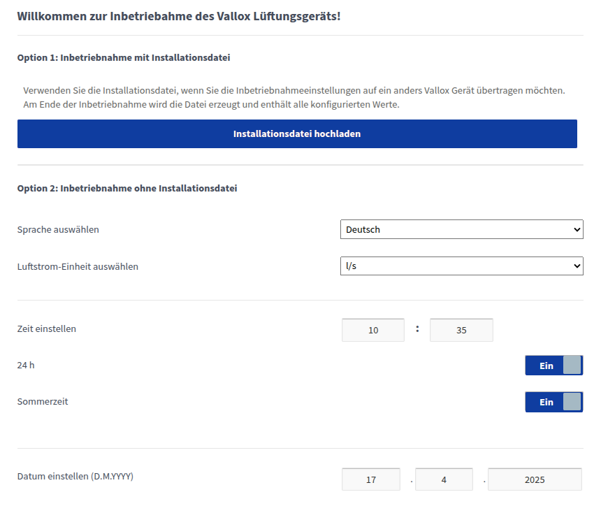 Es gibt zwei Möglichkeiten, das Vallox-Lüftungsgerät in Betrieb zu nehmen: Inbetriebnahme mit oder ohne einer Installationsdatei. Verwenden Sie die Installationsdatei, wenn Sie die Einstellungen von einer vorherigen Inbetriebnahme übertragen möchten. Die Installationsdatei wird am Ende des Inbetriebnahmevorgangs erstellt und enthält alle während der Inbetriebnahme vorgenommenen Werte.