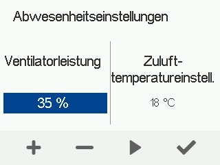 Sie können auch die Ventilatorleistung und die Zulufttemperatur für den Abwesend-Modus einstellen und die Luftfeuchtigkeits- und Kohlendioxidregelung deaktivieren.