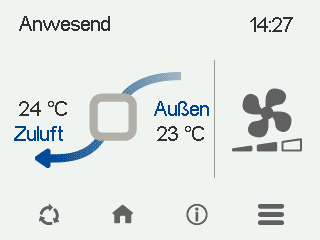 - Stellen Sie mit den Plus und Minus die Soll-Zulufttemperatur für diesen Lüftungsmodus ein.Sie können die Temperatur zwischen +5 °C und +25 °C einstellen. Die empfohlene Temperatur liegt bei +18 °C oder 2-3 °C unter der Raumtemperatur.