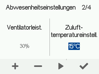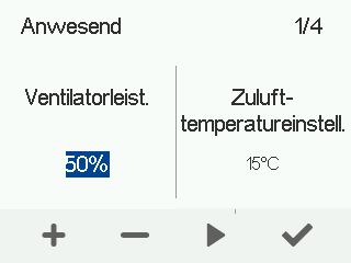 - Stellen Sie mit den Plus- und Minus-Tasten die Ventilatorleistung als Prozentwert der maximalen Leistung für diesen Lüftungsmodus ein.