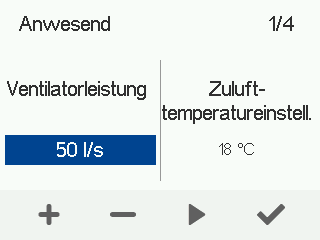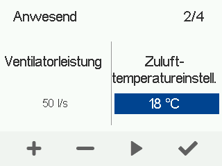 - Stellen Sie mit den Plus- und Minus-Tasten den Sollwert der Zulufttemperatur ein. Der Abluftstrom wird automatisch in Abhängigkeit vom Zuluftstrom angepasst, ohne dass der Benutzer ihn extra einstellen muss.
