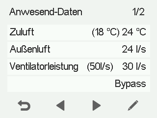 - Abluft — Gibt den Abluftstrom-Istwert an (l/s oder m³/h). Die Abluftstromeinstellung wird automatisch basierend auf den Zuluftstrom ermittelt und kann vom Benutzer nicht angepasst werden.