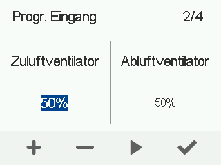 - Stellen Sie mit den Plus- und Minus-Tasten die Zuluftventilatorleistung als Prozentwert der maximalen Leistung für den programmierbaren Eingang ein.