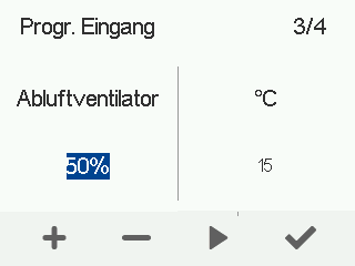 - Stellen Sie mit den Plus- und Minus-Tasten die Abluftventilatorleistung als Prozentwert der maximalen Leistung für den programmierbaren Eingang ein.