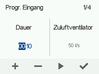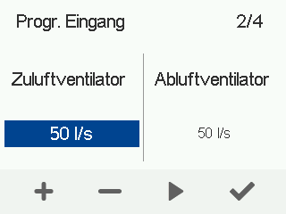 - Stellen Sie die Luftströme für den Zuluftventilator und für den Abluftventilator des programmierbaren Eingangs ein (l/s oder m3/h).Anmerkung:Zum Ausgleichen von Druckunterschieden sollte die Differenz zwischen Zu- und Abluftstrom nicht mehr als 30 % betragen.