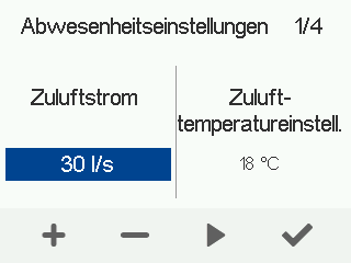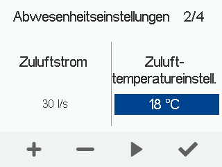- Stellen Sie mit den Plus und Minus die Soll-Zulufttemperatur für diesen Lüftungsmodus ein.Der Temperaturbereich liegt bei +5 °C bis +25 °C.