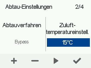 - Stellen Sie die Soll-Zulufttemperatur während des Abtauens ein. Der Temperaturbereich liegt bei +12 °C bis +20 °C. Die Werkseinstellung ist +15 °C.