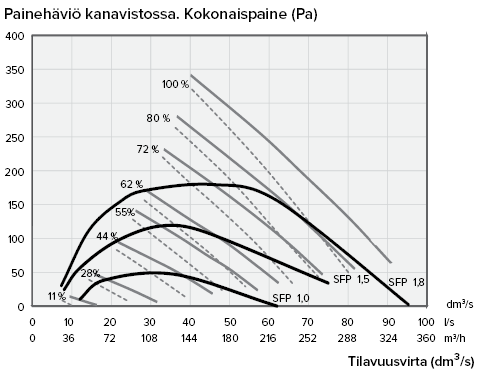 Empfohlener SFP-Wert (Spezifische Ventilatorleistung) < 2,0 (kW/m3/s). Wenn ein niedrigerer Gesamtdruck verwendet wird, ist auch die SFP der Leistung verringert.