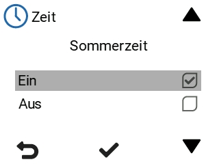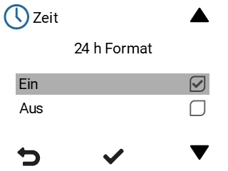 Zeit und DatumStellen Sie die Zeit ein.Wählen Sie 24 h Ein / Aus aus.Wählen Sie das Datum aus und stellen Sie die Sommerzeit Ein / Aus ein.