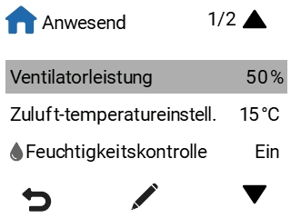 Lüftungsmodus-Einstellungen ändernWählen Sie Einstellungen der Lüftungsmodi im Hauptmenü.Wählen Sie den zu bearbeitenden Lüftungsmodus aus.Das Bearbeitungsmenü öffnet sich.