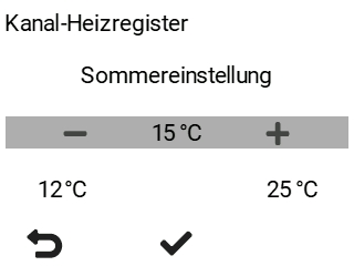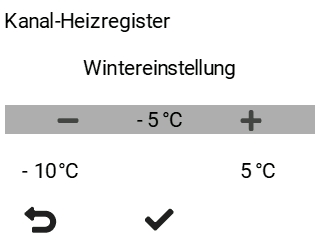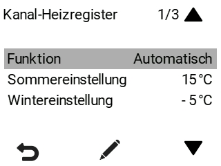 - Automatik — Im Sommer wird die eingestellte Zulufttemperatur beibehalten. Im Winter wird das Kanalregister eingeschaltet, wenn die Außenlufttemperatur unter die Wintereinstellung fällt.