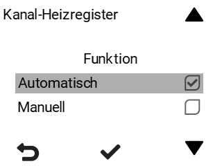 - Manuell — Die Zuluftgrenze kann manuell eingestellt werden. Fällt die Zulufttemperatur unter den eingestellten Wert, wird das Kanalregister abgeschaltet.