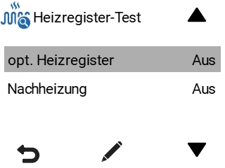 - Wählen Sie mit den Pfeiltasten Heizregistertest: