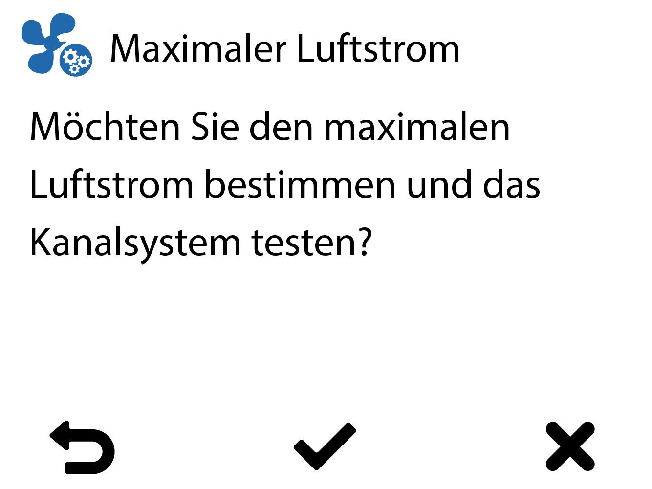 Sie können den maximalen Luftstrom des Lüftungsgeräts in dem verwendeten Kanalsystem messen. Der Test dauert nicht länger als eine Minute und ist nicht verpflichtend. Um den Test zu überspringen, wählen Sie Abbrechen: . Wird der Test übersprungen, wird der Standardwert für den maximalen Luftstrom verwendet.