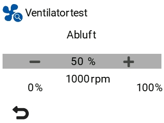 - Stellen Sie mit den Plus- und Minus-Tasten die Zuluftmenge als Prozentwert der maximalen Leistung ein.Sie können hören, wenn sich die Ventilatorleistung entsprechend dem eingestellten Wert ändert. Die Ventilatorleistung wird im rpm-Feld angezeigt.