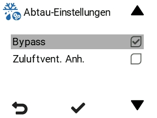 Bypass (Werkseinstellung) — Der Wärmetauscher wird von der Zuluftseite umgangen. Die Zu- und Abluftventilatoren funktionieren normal, und das Lüftungsverhältnis bleibt während des Abtauens konstant. Dadurch werden Zugerscheinungen oder durch Druckunterschiede verursachte Luftunterbrechungen vermieden. Diese Einstellung wird für dichte Gebäude empfohlen, in denen Unterdruck auftreten kann. Bei Verwendung der Bypass-Funktion müssen der Nachheizwiderstand des Lüftungsgeräts und der optionale Zusatzheizwiderstand aktiviert werden.