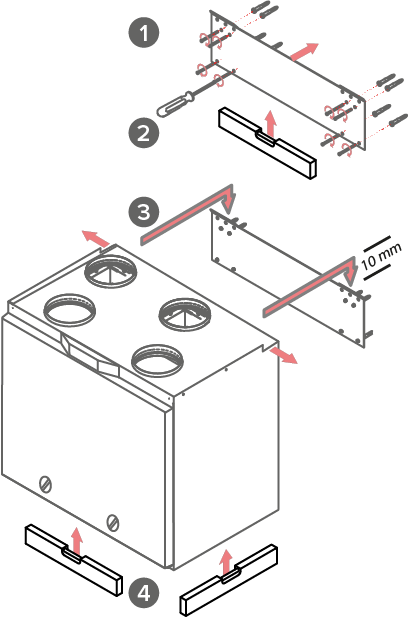 Hängen Sie das ValloPlus 240 MV-K auf die Montageplatte. Achten Sie darauf, dass die Befestigungspunkte links und rechts am Gerät, sowie links und rechts an der Montageplatte ineinander greifen.