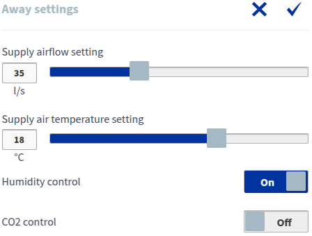 - Ieplūdes gaisa plūsmas iestatījums — Parāda ventilācijas iekārtai iestatīto ieplūdes gaisa plūsmas ātrumu (l/s vai m3/h). Ja ir iespējota automātiskā palielināšana (piem., mitruma vai oglekļa dioksīda kontrole), faktiskais gaisa plūsmas ātrums var atšķirties no iestatītās vērtības. Faktiskais ieplūdes gaisa plūsmas un nosūces gaisa plūsmas ātrums tiek parādīts atsevišķi sadaļā Informācija.