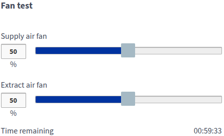 - Lai pārbaudītu ieplūdes gaisa ventilatora darbību, pārvietojiet zilo slīdni Ieplūdes gaiss un klausieties, kā ventilatora ātrums mainās saskaņā ar iestatīto jaudu.