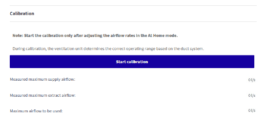 Pēc kalibrēšanas tiek parādītas iekārtas maksimālās ieplūdes un nosūces gaisa plūsmas.