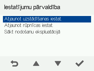 - Atjaunot uzstādīšanas iestatījumus — atjauno ventilācijas iekārtas iestatījumus, kas konfigurēti uzstādīšanas laikā.