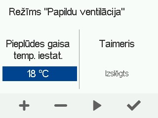Režīma Papildu ventilācija iestatījumi