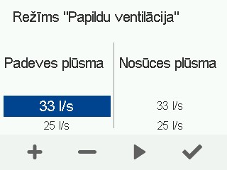 Gaisa plūsmas režīmā Papildu ventilācija ir automātiski par 30% augstākas nekā gaisa plūsmas režīmā Mājās, taču tās var pielāgot. Citi režīma Papildu ventilācija iestatījumi tiek konfigurēti identiski iestatījumiem režīmā Mājās. Var iestatīt arī taimeri režīmā Papildu ventilācija.