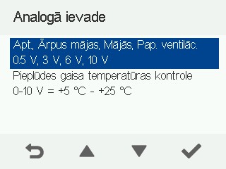 Analogās ievades tiek izmantotas, kad ventilācijas iekārta tiek vadīta ar sprieguma signāliem. Kad tiek izmantoti sprieguma signāli, ventilācijas režīms tiek mainīts atbilstoši ārējam spriegumam no tvaika nosūcēja, ārējā vadības paneļa vai ēkas automatizācijas sistēmas. Analogā ievade ir pievienota AN/I un GND spailēm ventilācijas iekārtas savienojumu kārbā.