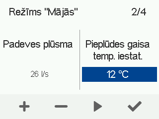 - Izmantojiet pogas Plus un Mīnus pogas, lai iestatītu mērķa pieplūdes gaisa temperatūru šim ventilācijas režīmam.Jūs varat iestatīt temperatūru diapazonā no +5 °C līdz +25 °C. Ieteicamā temperatūra ir +18 °C vai 2–3 °C zem telpas temperatūras.