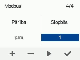 - Izmantojiet pogas Plus un Mīnus, lai iestatītu Modbus Stopbits. Iespējas ir 1 un 2.