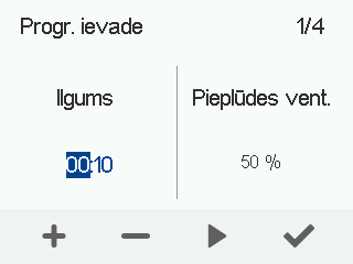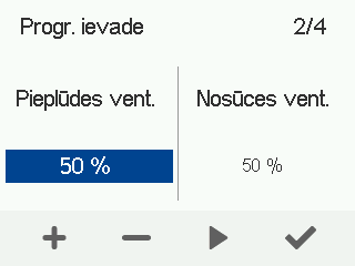 - Izmantojiet pogas Plus un Mīnus, lai iestatītu pieplūdes gaisa ventilatora jaudu kā procentuālo daļu no maksimālās jaudas programmējamai ievadei.
