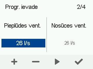 - Iestatiet programmējamās ievades pieplūdes gaisa ventilatora un nosūces gaisa ventilatora gaisa plūsmas (l/s vai m3/st.).IEVĒRĪBAI:Kompensējot spiediena atšķirības, starpība starp pieplūdes un nosūces gaisa plūsmām nedrīkst pārsniegt 30%.