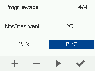 - Iestatiet mērķa pieplūdes gaisa temperatūru programmējamajai ievadei. Temperatūras diapazons ir +5 °C – +25 °C. Rūpnīcas iestatījums ir 15 °C.