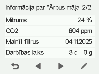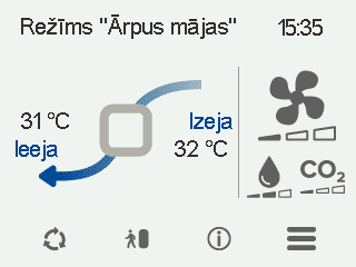 - Ieplūdes gaiss — Norāda faktisko dzīvoklī ieplūstošā gaisa temperatūru un pieplūdes gaisa temperatūras iestatījumu (iekavās), ja pieplūdes gaiss ir siltāks par iestatīto vērtību.