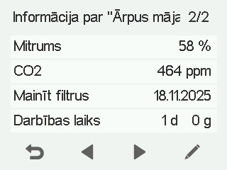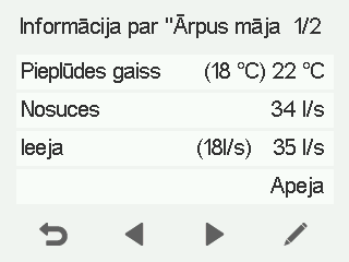 - Ieplūde — Norāda pašreizējo ieplūdes gaisa plūsmu (l/s vai m³/h). Ja ventilācijas iekārta automātiski palielina gaisa plūsmu, reaģējot uz paaugstinātu mitruma vai oglekļa dioksīda līmeni vai dzesēšanas nepieciešamību, faktiskā gaisa plūsma var būt lielāka nekā iestatītā vērtība. Iestatītā vērtība ir redzama iekavās.