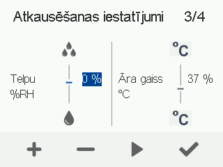 - Izmantojiet pogas Plus un Mīnus, lai pielāgotu mitruma līmeni. Rūpnīcas iestatījums ir 0%, kas atbilst normālam gaisa telpās mitruma līmenim. Mitruma diapazons ir -50% – +50% RH.