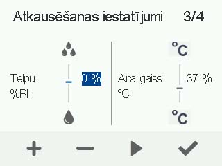 - Izmantojiet pogas Plus un Mīnus, lai iestatītu āra gaisa temperatūru. Iestatījumu diapazons ir 0–100%. Rūpnīcas iestatījums ir atkarīgs no ventilācijas iekārtas tipa.