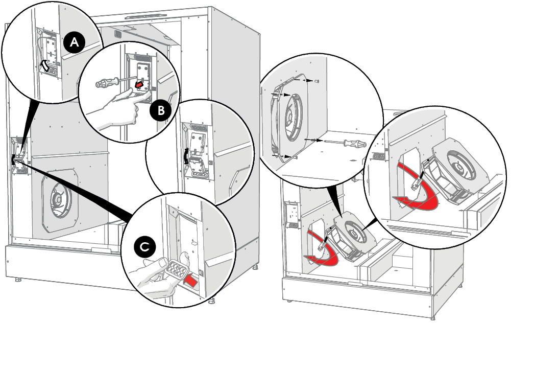Pārbaudiet nosūces gaisa ventilatoru tādā pašā veidā. Nosūces gaisa ventilators iekārtā atrodas simetriski pretējā pusē.
