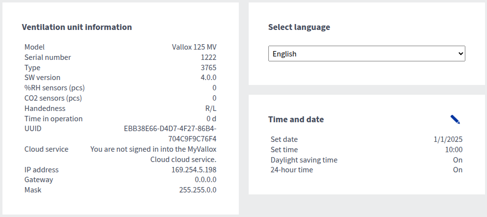 - „MyVallox Cloud UUID“ – unikalus vėdinimo įrenginio ID „MyVallox Cloud“ paslaugai.