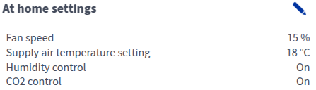 Šis Namuose režimas leidžia peržiūrėti informaciją, susijusią su vėdinimo įrenginio režimu.
