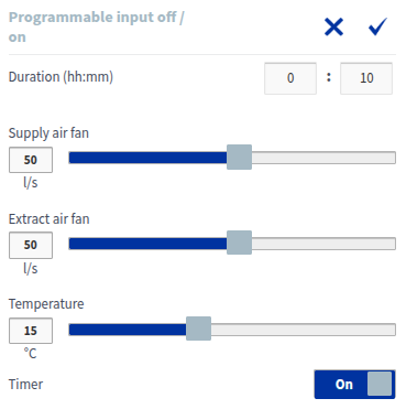 Nustatykite pageidaujamą tiekiamo oro temperatūros nuostatą programuojamai įvesčiai. Galite reguliuoti temperatūrą nuo +5 °C iki +25 °C. Gamyklinė nuostata yra 15 °C.PASTABA:Aukštos temperatūros poreikis (>20 °C) gali padidinti energijos suvartojimą, nes vėdinimo įrenginys turi daugiau naudoti papildomo šildymo rezistorių.Programuojamos įvesties laikmatis veikia tik su mygtuko funkcija. Kitais atvejais programuojama įvestis išlieka aktyvi, kol pasikeičia skaitmeninės įvesties įtampa.