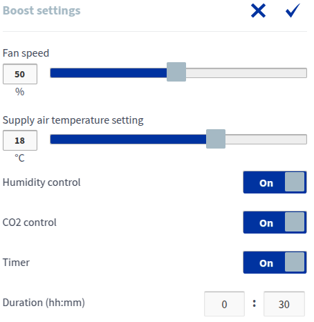 - Išjungti – kai laikmatis išjungtas, pasirinktas vėdinimo režimas bus naudojamas, kol režimas bus pakeistas rankiniu būdu arba automatiškai savaitiniame laikrodyje.