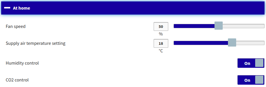 Ventiliatoriaus greičiai režimu „Namuose“