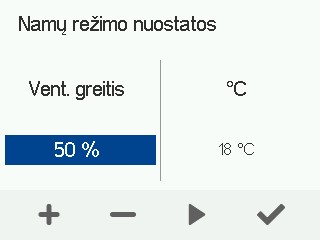 - Galite reguliuoti ventiliatoriaus greitį ir Namuose režimo tiekiamo oro temperatūrą ir išjungti drėgmės bei anglies dioksido kontrolę.