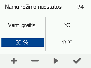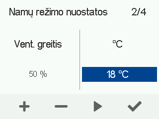 - Naudokite pliuso ir minuso mygtukus, kad nustatytumėte tikslinę tiekiamo oro temperatūrą šiam vėdinimo režimui.Galite nustatyti temperatūrą nuo +5 °C iki +25 °C. Rekomenduojama temperatūra yra +18 °C arba 2–3 °C žemesnė nei kambario temperatūra.